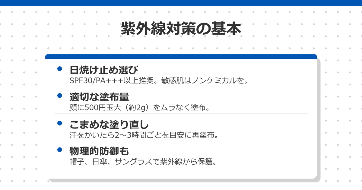 æ¥çŒãæ¢ãã¯SPF30/PA+++以äžãæ¯æ¥äœ¿çšãã2ïœ3æéããšã«å¡ãçŽããŸãããã