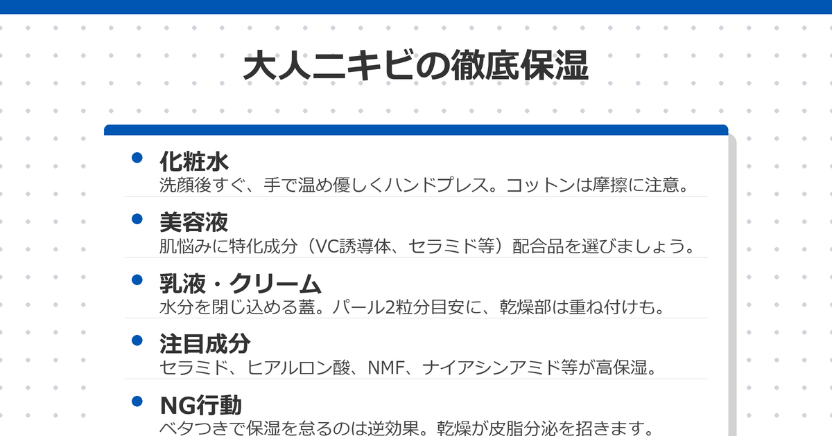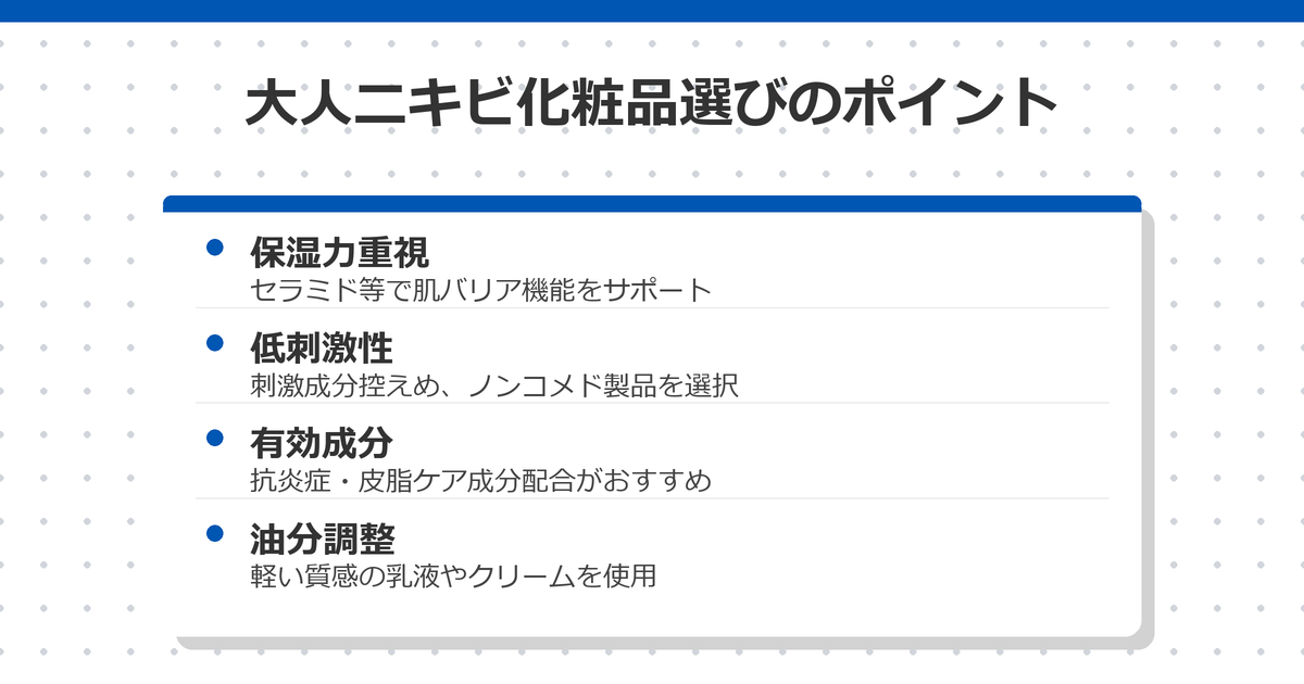æ²¹å: éåºŠãªæ²¹åã¯æ¯ç©Žè©°ãŸãã®åå ã«ãªãå Žåãããããã乳液ãã¯ãªãŒã ã¯è»œããã¯ã¹ãã£ãŒã®ãã®ãéžã¶ãã䜿çšéã調æŽããŸãããã