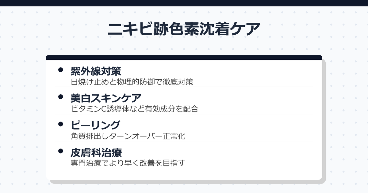 A3: ãããè·¡ã®è²çŽ æ²çã¯ãèã®ççåŸã«ã¡ã©ãã³ãéå°ã«çæãããããšã§çºçããŸããæ©ãæ²»ãããã«ã¯ã以äžã®æ¹æ³ãèããããŸãã